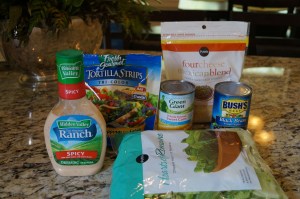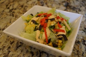 You just place the lettuce in a big bowl or individual bowls, top with a mixture of the beans and corn, sprinkle with cheese, as much dressing as desired and then finish it off with the tortilla strips. Yummy and pretty!