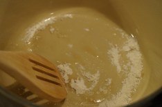 You start by combining the flour and canola oil in a saucepan over medium-low heat. Whisk this together and let bubble for 1 minute.
