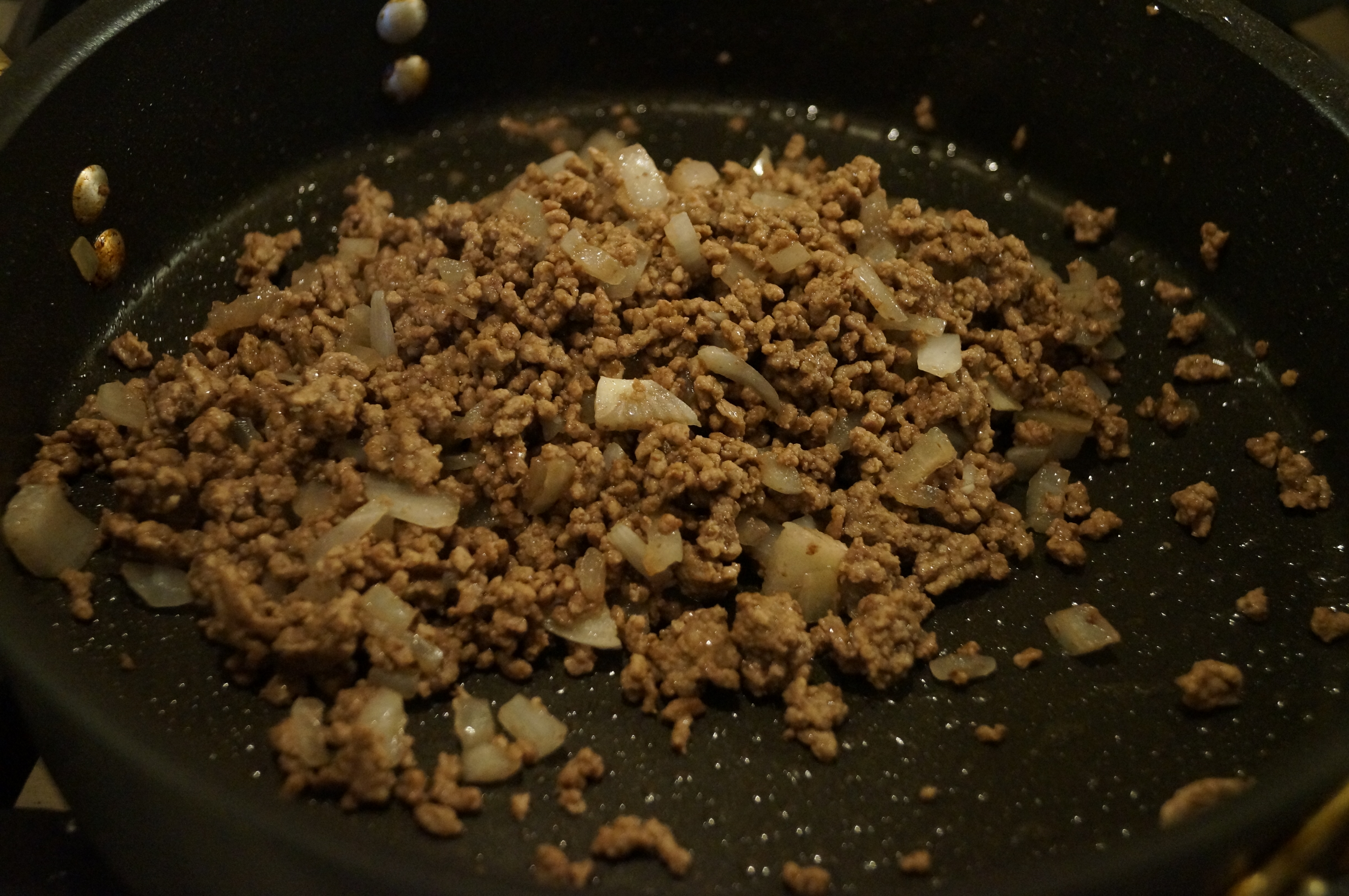 Layer meat mixture, (black olives if you wish), green onions and cheese.