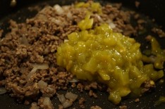 Brown the meat and onions in a large skillet and drain the fat. Add to that the green chillies and salt. Stir to combine. Remove from heat.