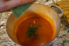 Then pour in the red sauce, chicken broth, salt and pepper. Bring to a boil, reduce heat and simmer.