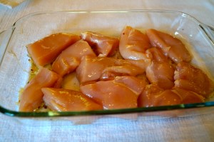 Now place your cut up chicken in dish. The original recipe had it as whole chicken breasts but chicken breasts are so big nowadays that I think one is too big a serving so at least halving them will make the recipe go farther.