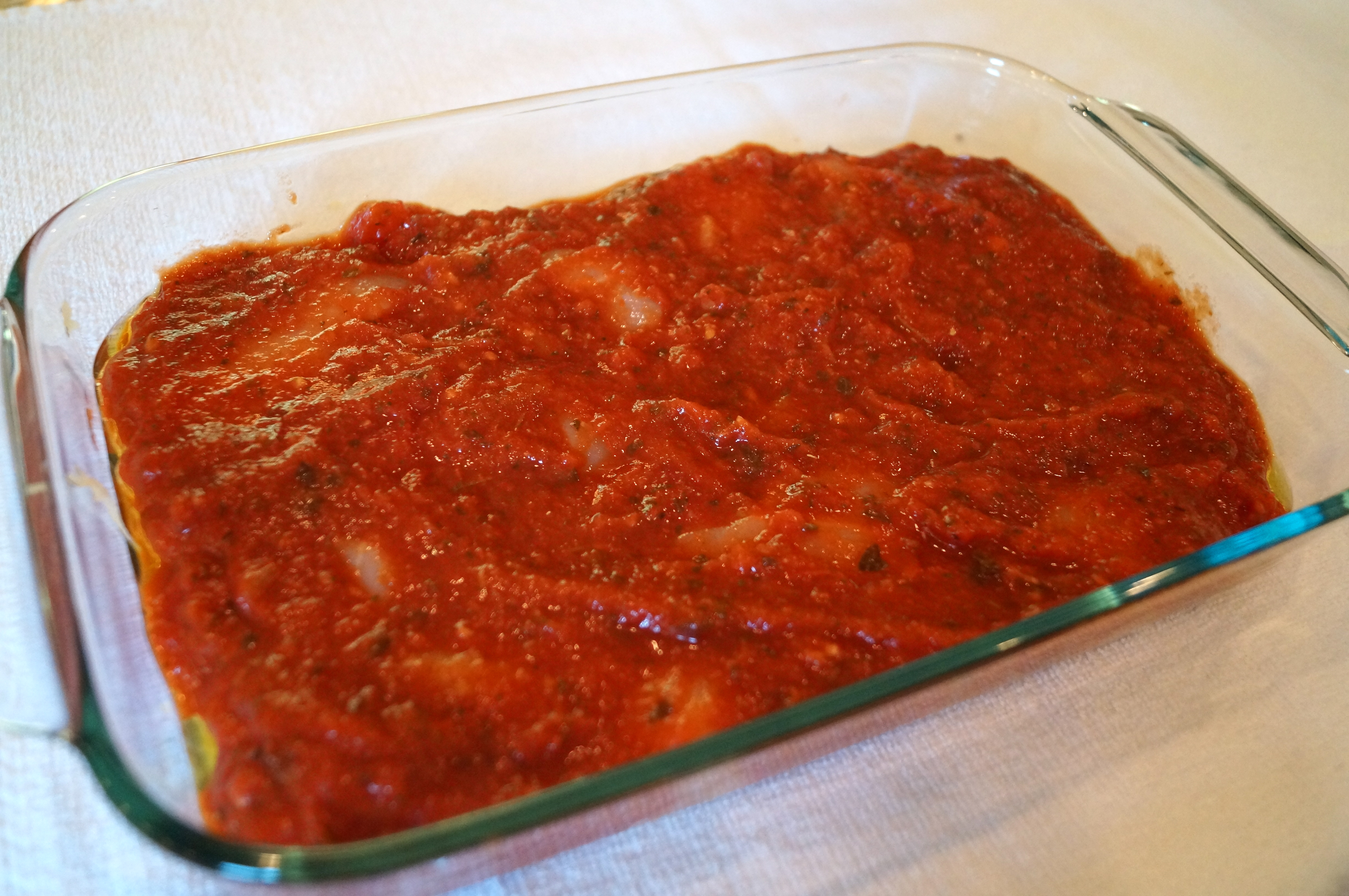 Layer with half the mozzarella and parmesan cheese. (I also added a sprinkling of dry italian seasoning to both cheese layers)