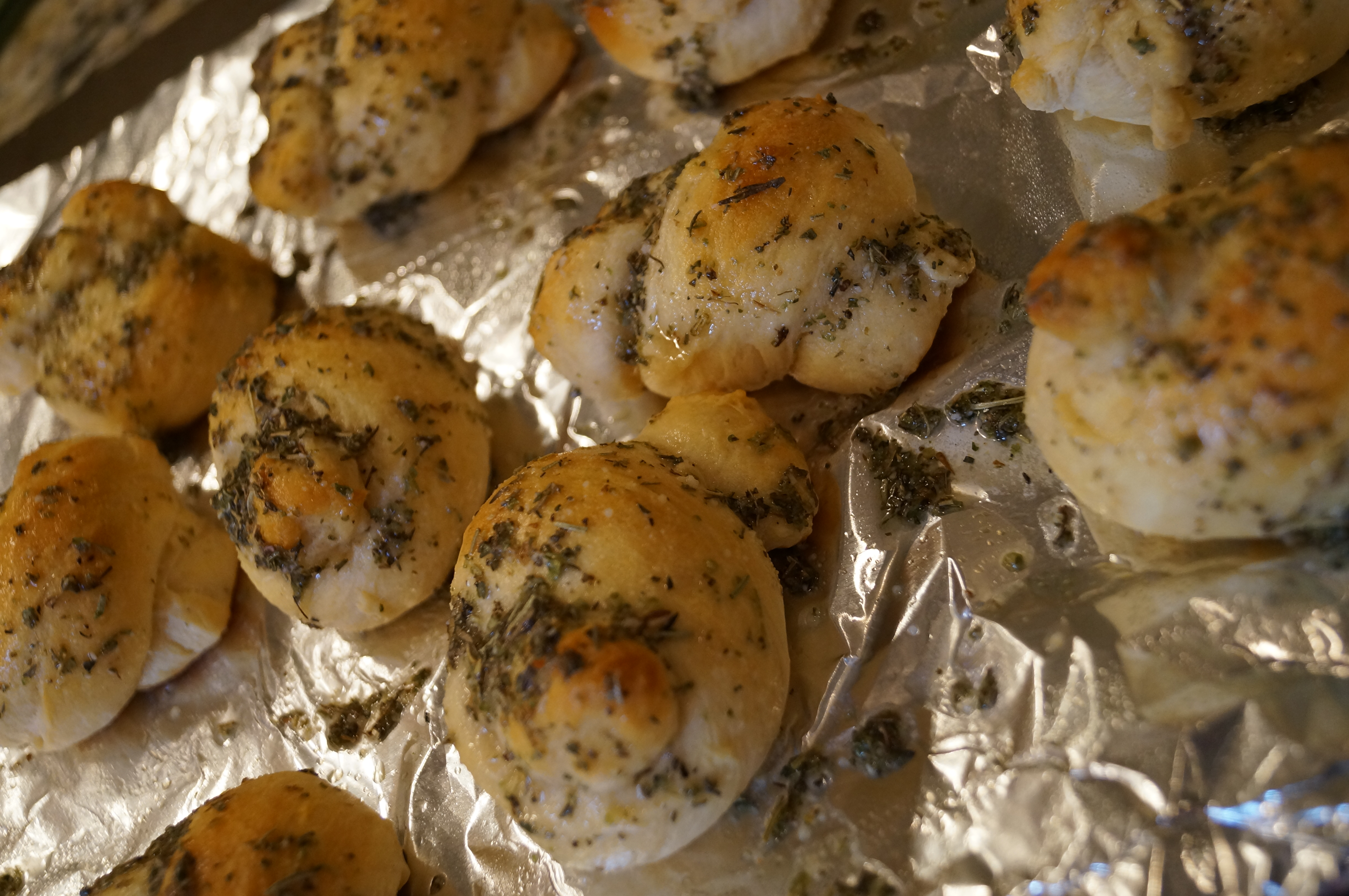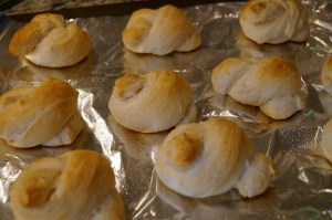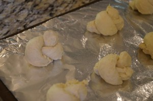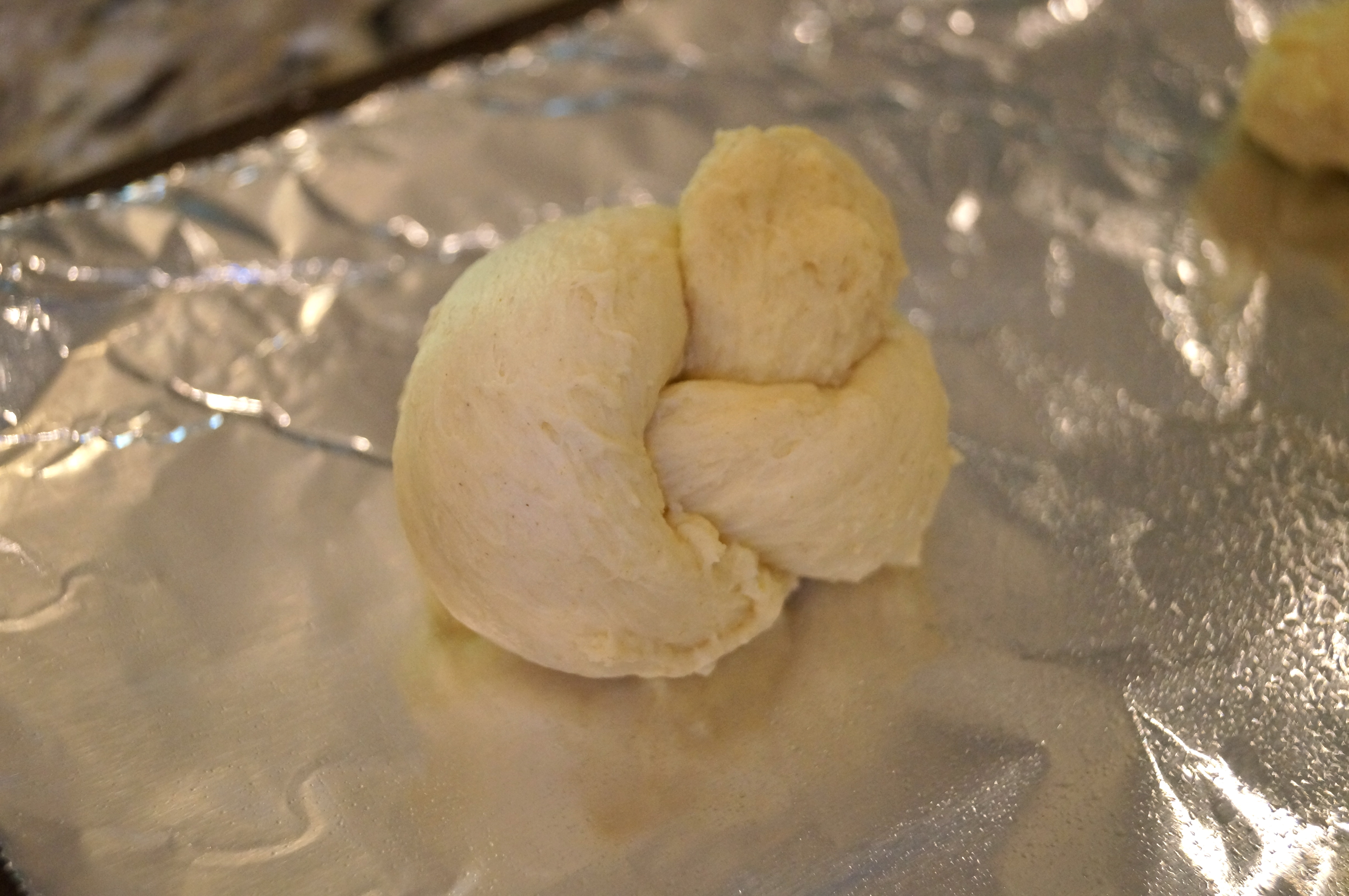 Take each biscuit and pull/roll out into a rope, tie in a knot, tuck ends under and place on a foil lined, Pam sprayed baking sheet.
