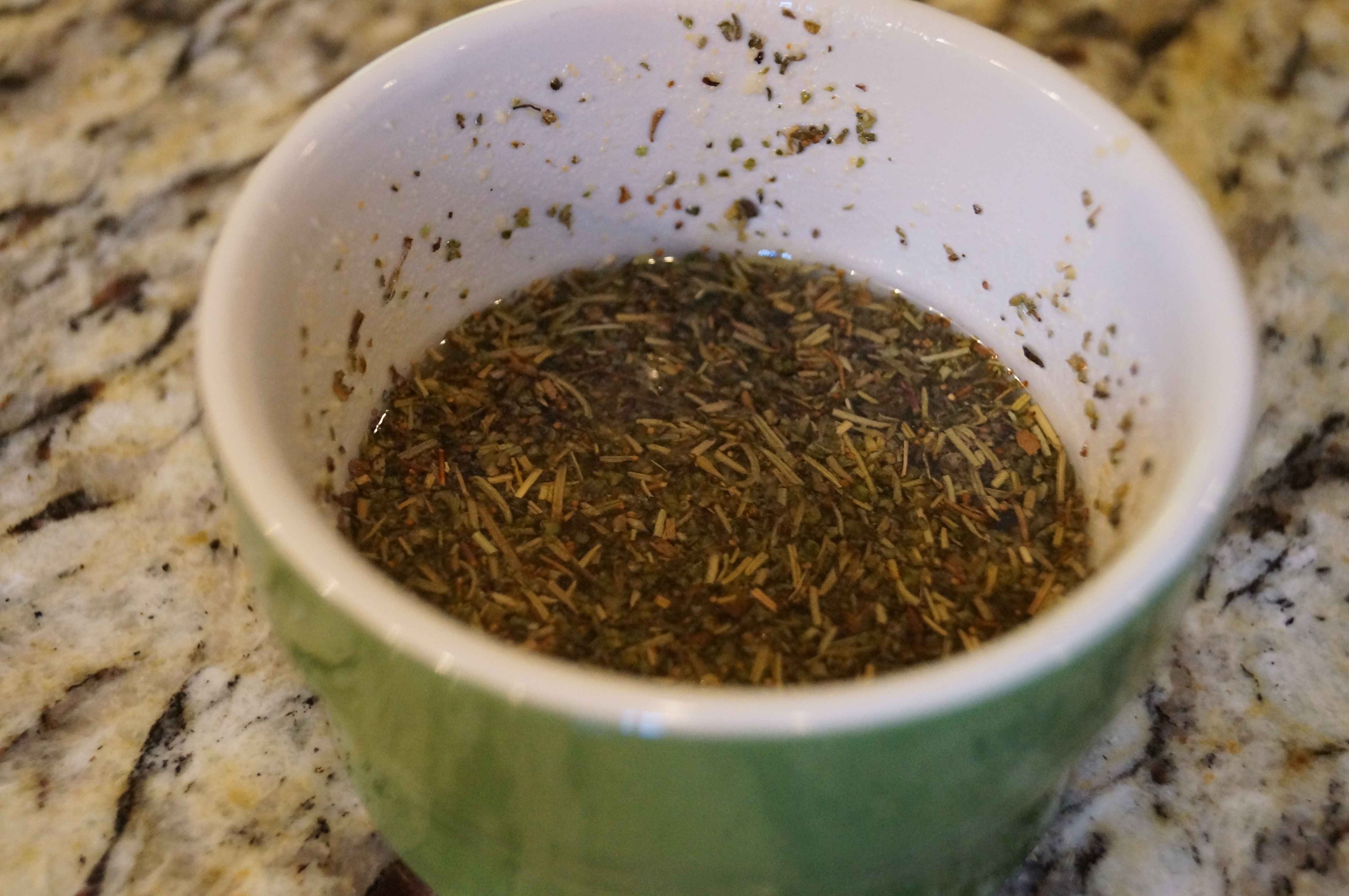 You start by pouring olive oil into a baking dish (the size determined by how much chicken you have). Next crush your garlic into dish. Mix garlic in and evenly spread on the bottom.