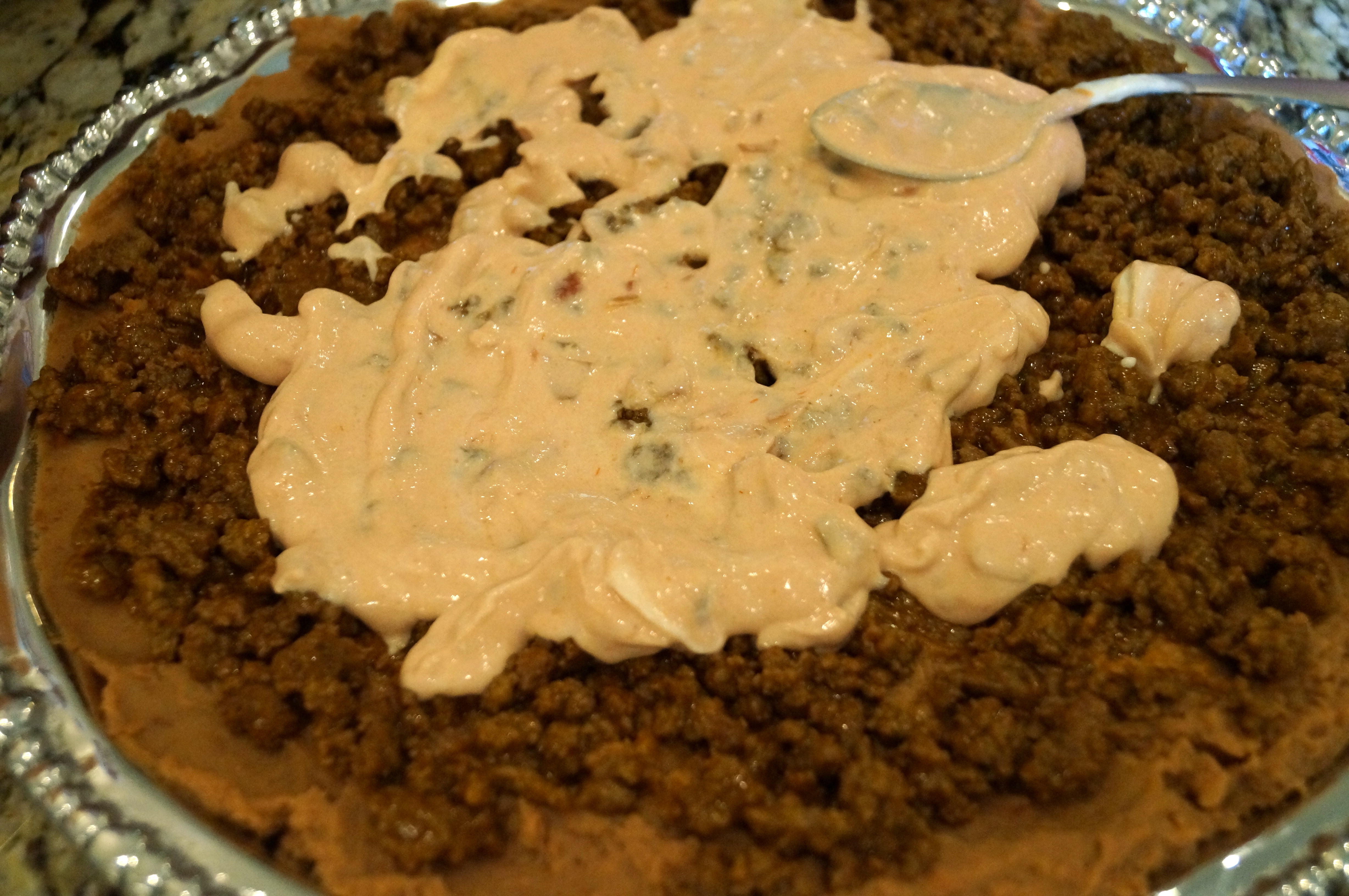 Next you start by layering refried beans.