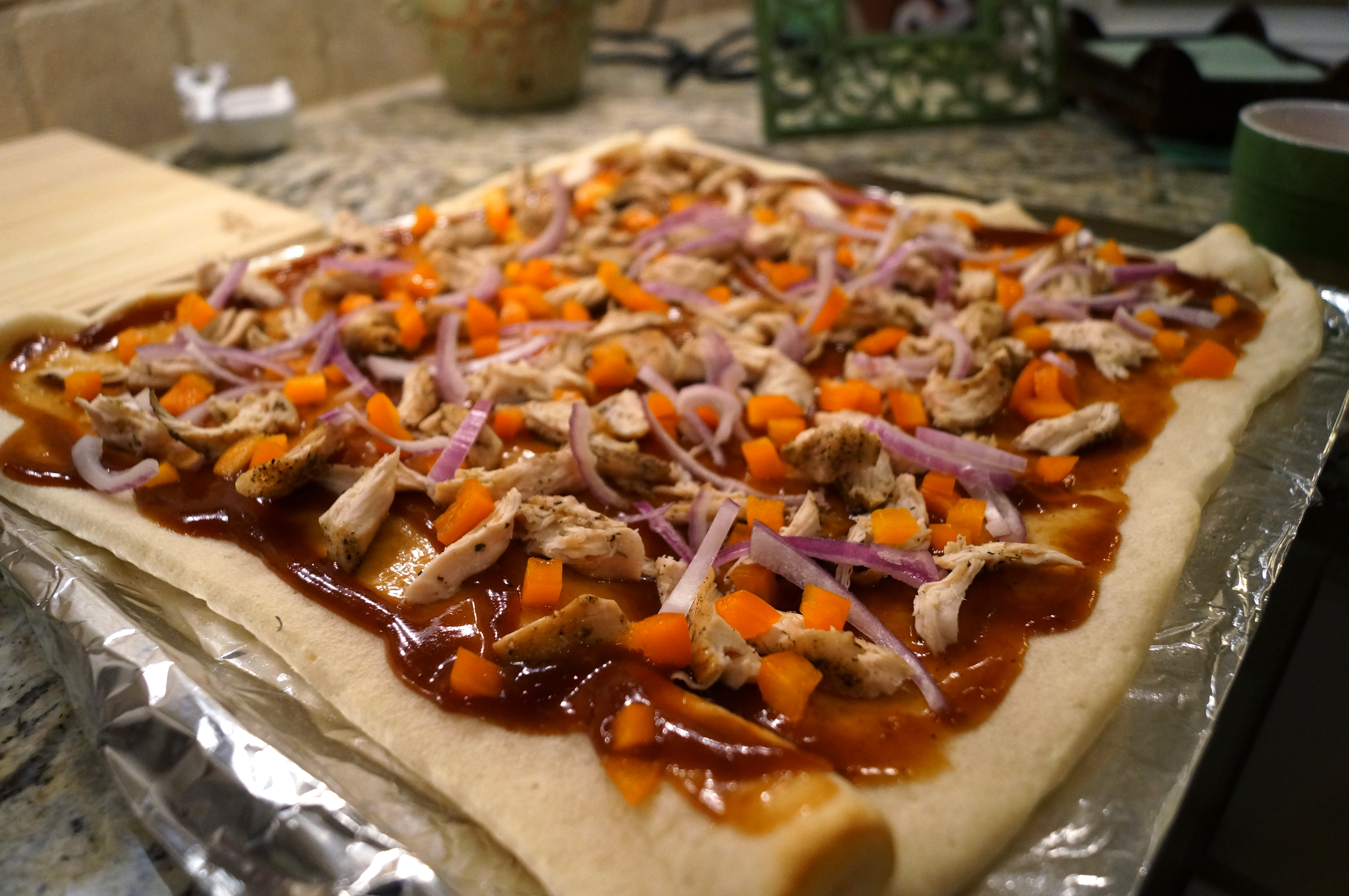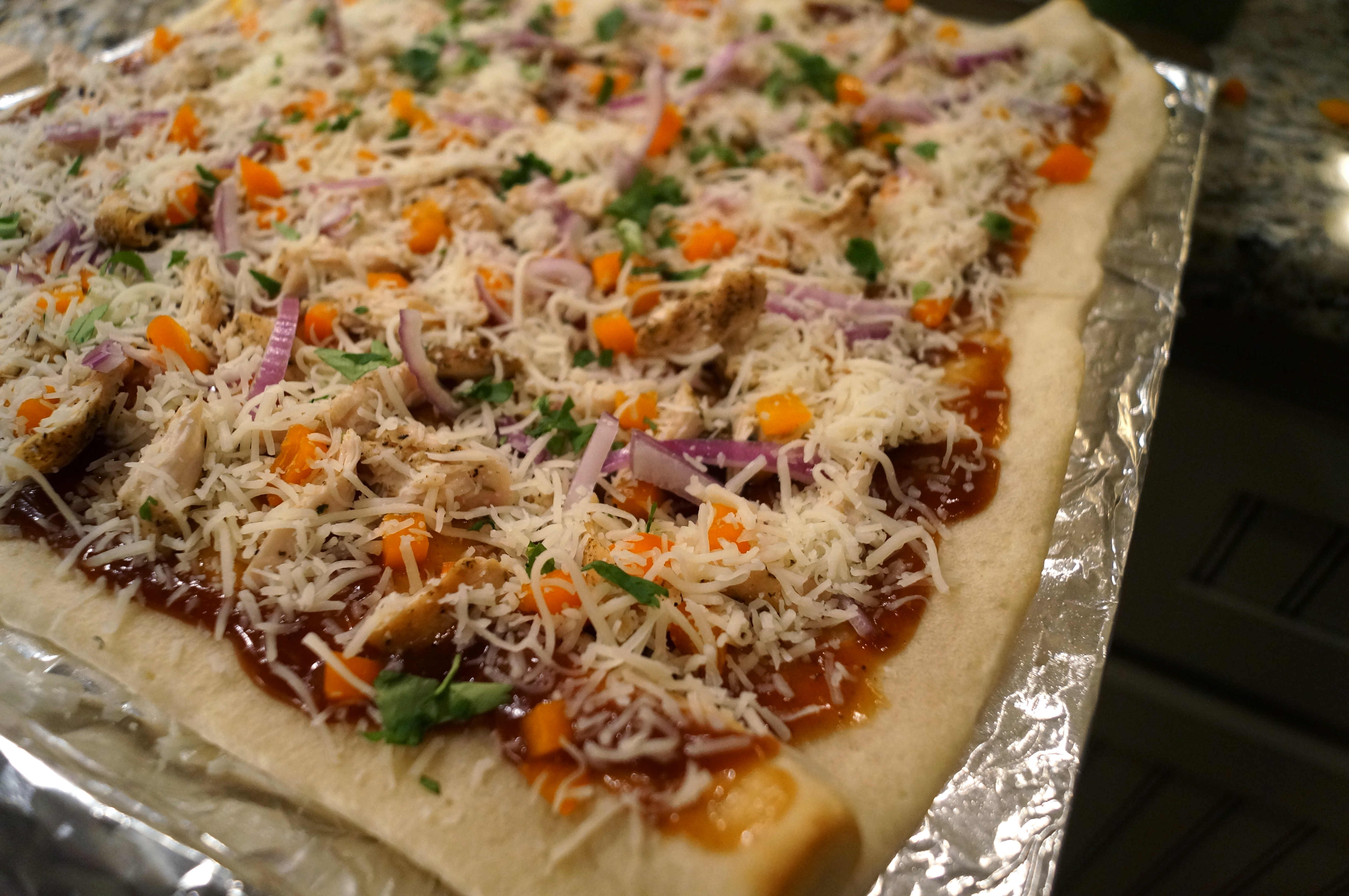 BBQ Chicken Pizza. Should be pretty simple and will go perfectly with the left over Cheesecake in the fridge. 🙂