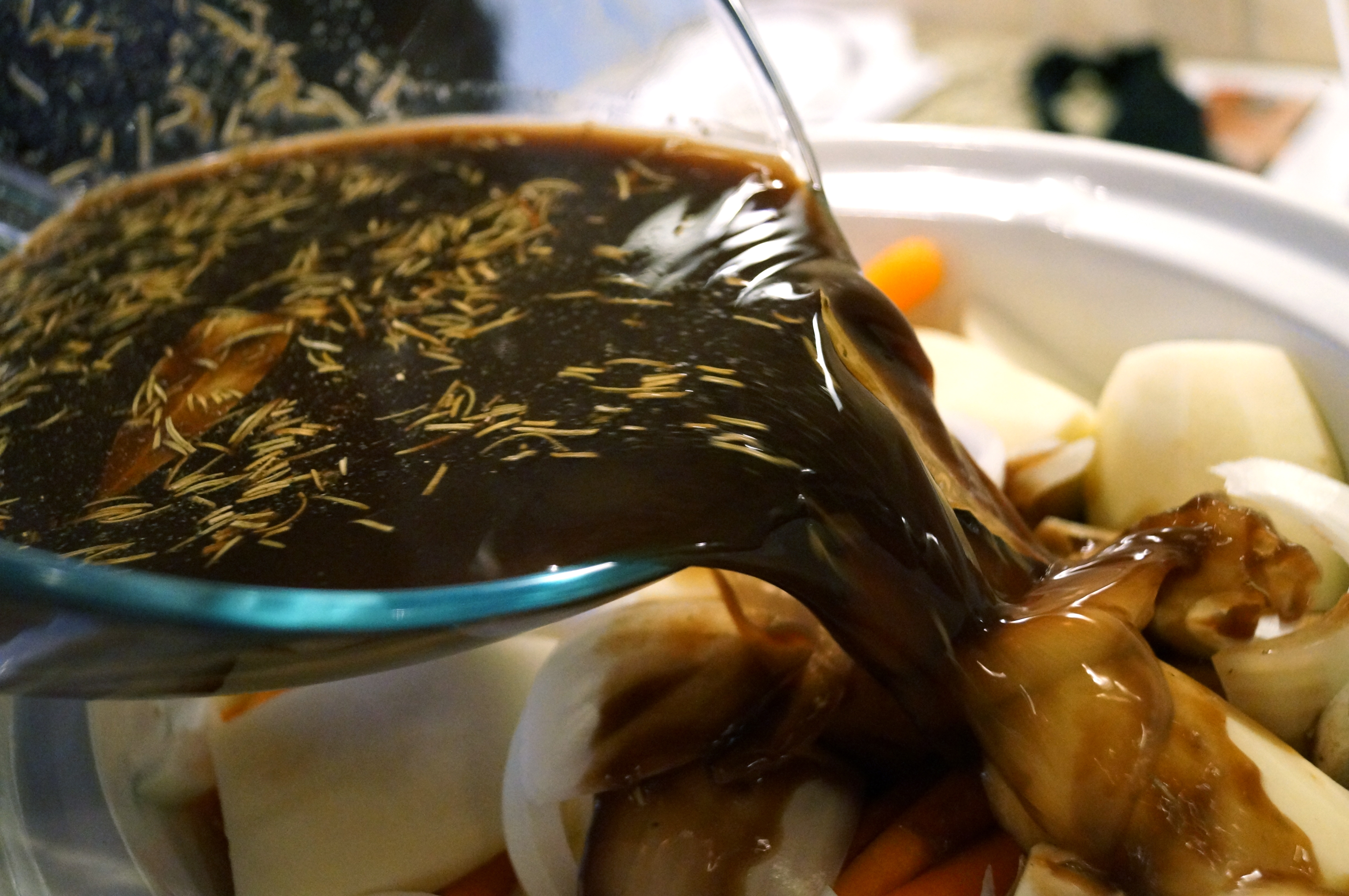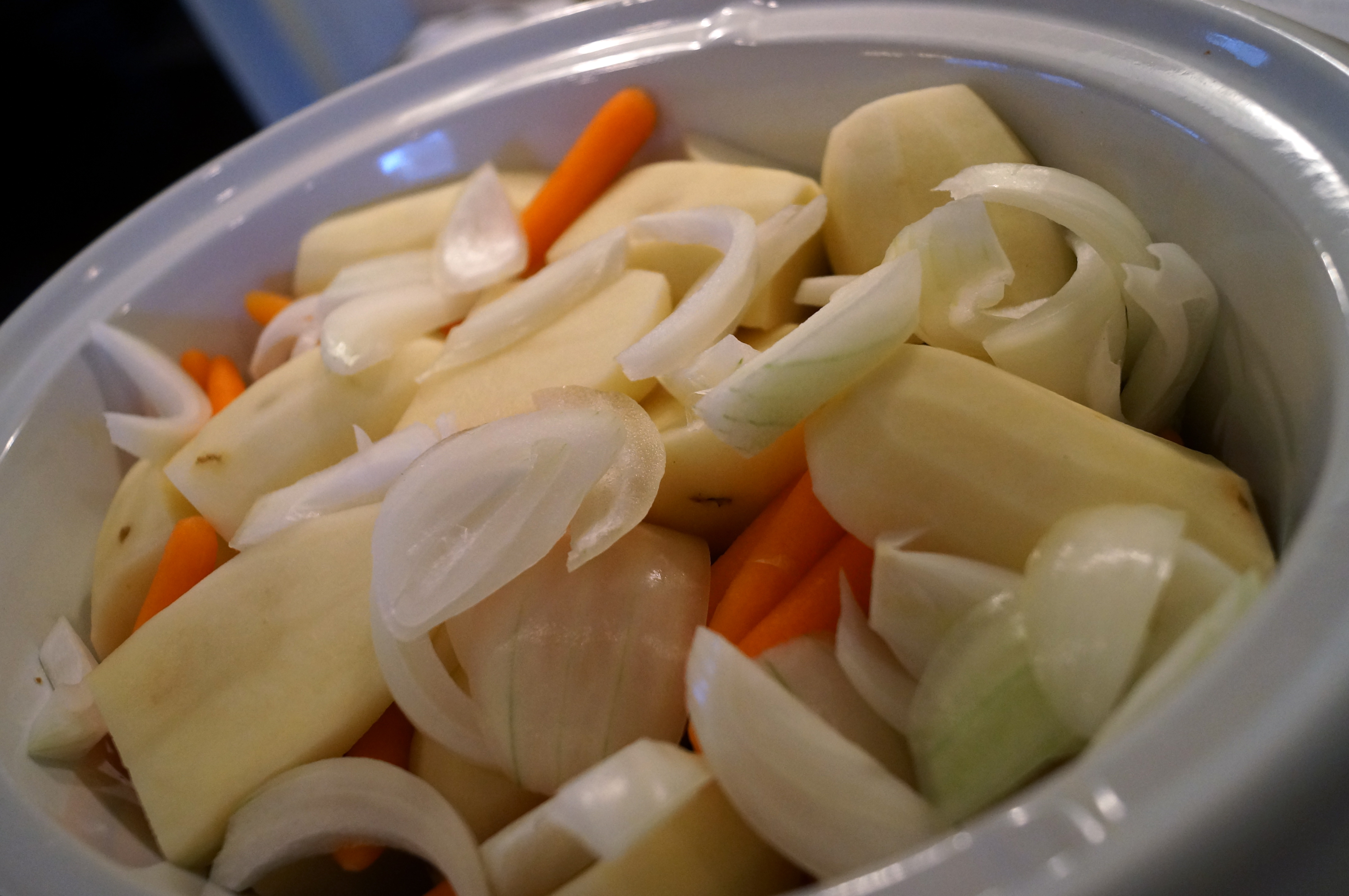 Add water and deglaze pan. Stir in Bouillon cubes and potatoes, cook at a simmer for 20 minutes.