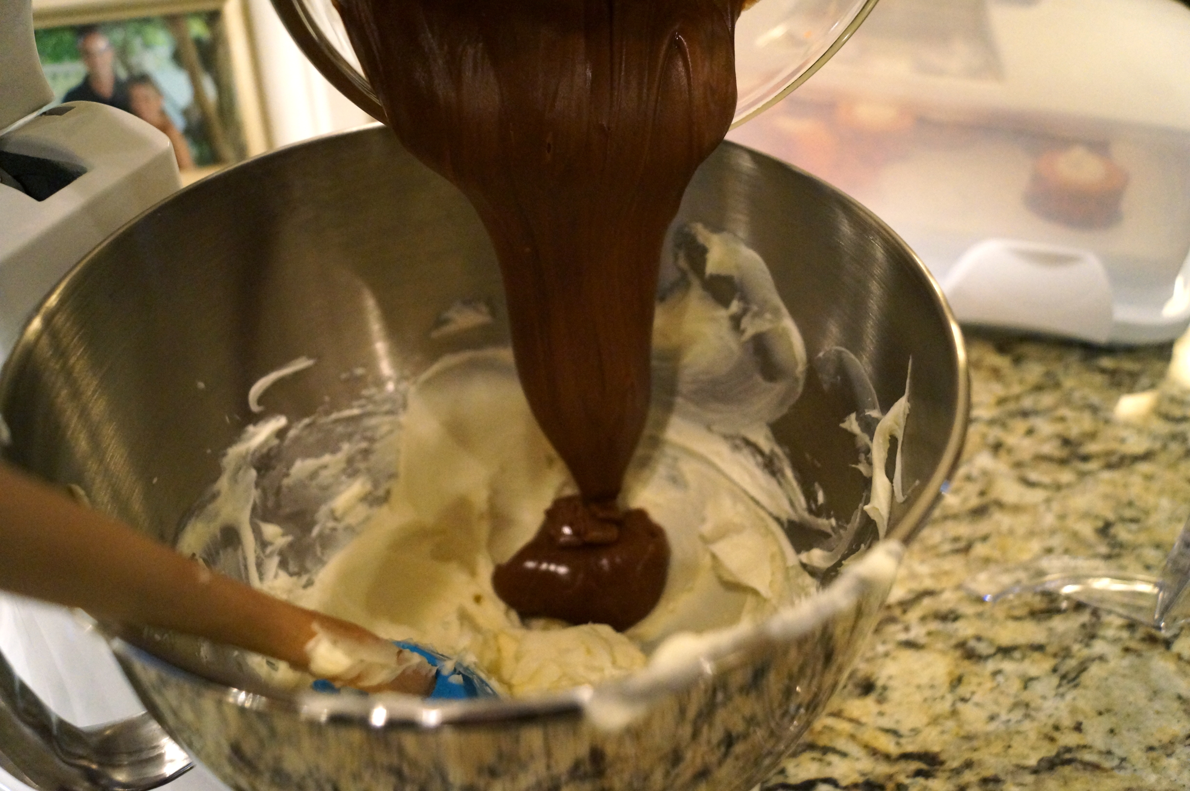 Place chocolate in a small bowl. Heat ½ cup of heavy cream in sauce pan over medium heat until simmering and pour over chocolate. Let sit for 3-5 minutes and then whisk it until well combined.